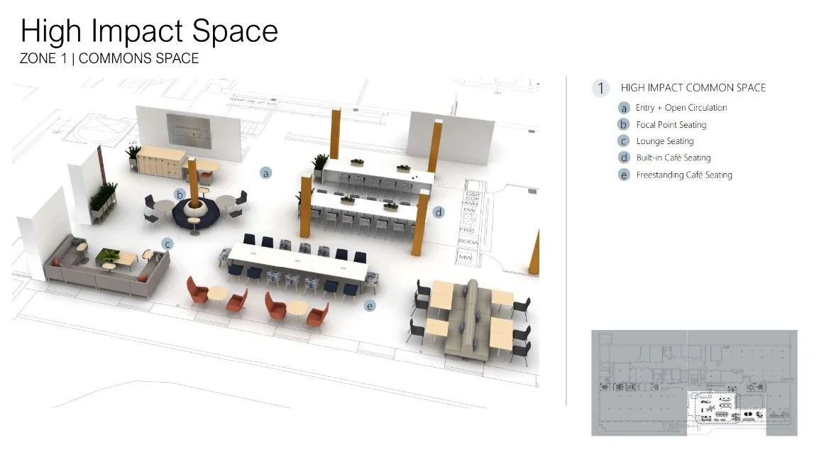 Design: Interviews with employees to understand use case and existing pain points. Calculate minimum seating needs, on-site observation study of wayfinding, circulation, and utilization.